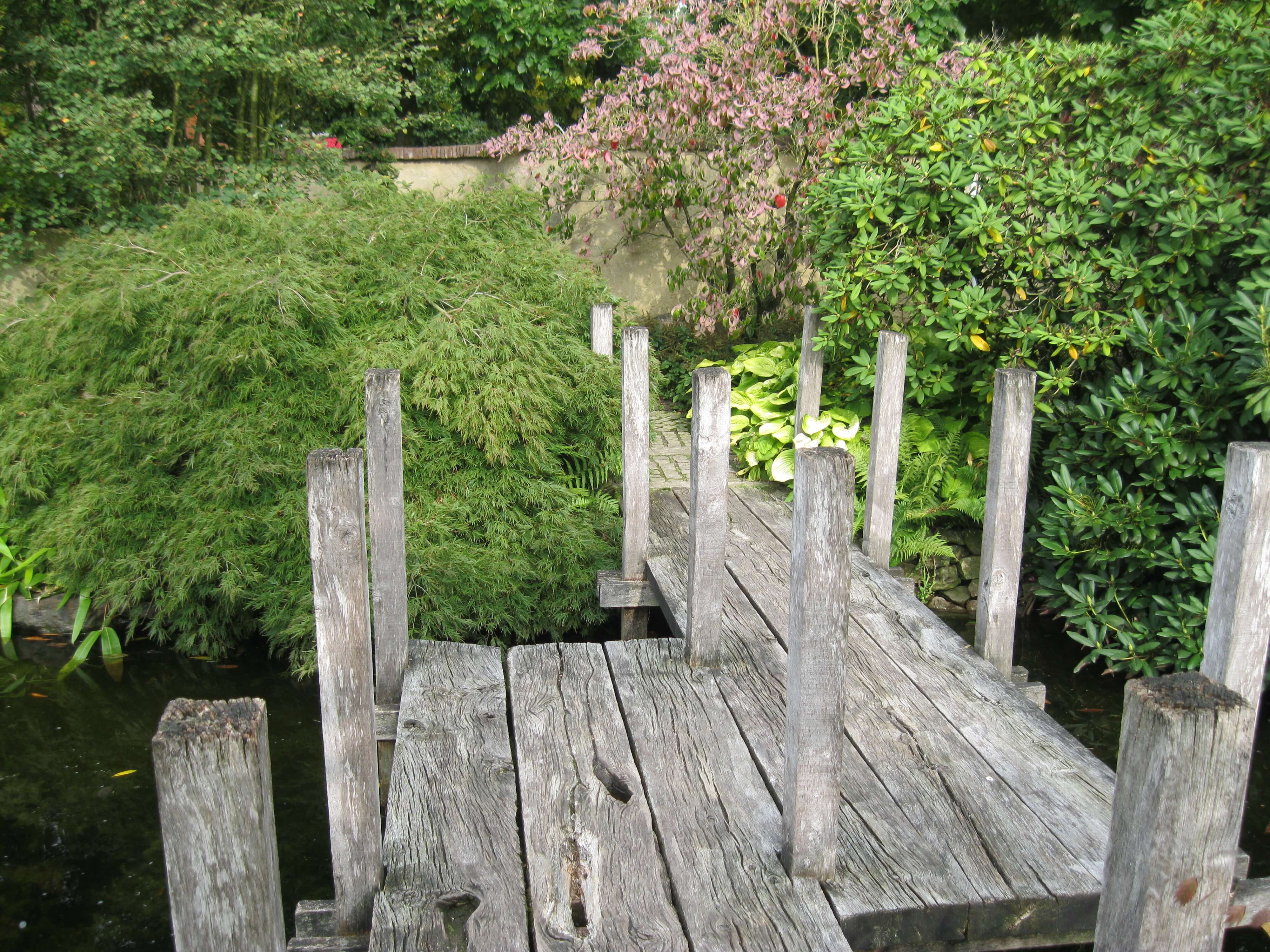 Holzsteg über einem idyllischen Gartenteich